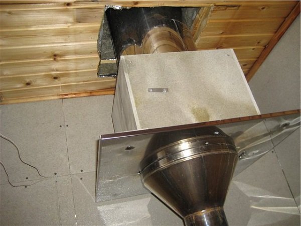 Le périmètre du trou préparé pour la sortie de la cheminée doit être de 150 mm. dépasser le périmètre du tuyau de chaque côté, lorsqu'il s'agit de matériaux combustibles, et de 100 mm. de chaque côté si nous parlons de non-combustible. Si le tuyau passe à travers le gâteau de toiture fini, vous devez protéger le passage avec une boîte, dont chaque côté doit être de 150 mm. côtés plus appropriés de la cheminée. La distance qui en résulte entre le tuyau et le conduit doit être remplie d'un matériau isolant thermique non combustible qui n'a pas peur de l'humidité.
