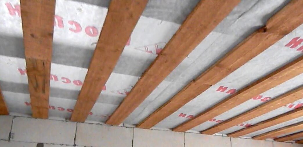 - Pose d'une couche hydro-isolante vapeur en surface. Dans le processus, le film est attaché non seulement au plafond, mais également aux poutres intermédiaires, en tenant compte des courbures.
