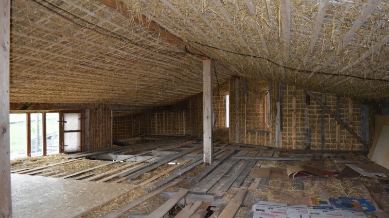 Ces matériaux d'isolation thermique naturelle ne sont désormais pratiquement plus utilisés pour réchauffer les toitures froides. Ceci est une conséquence de l'inflammabilité élevée de la paille et du foin. Mais, lorsqu'elle est combinée avec un mortier d'argile liquide, la paille pressée perd la combustibilité presque complètement. Dans certains cas, la paille est l'isolant le plus abordable, par exemple, lorsqu'une entreprise du district cultive du seigle ou du blé. Le seigle est préféré.