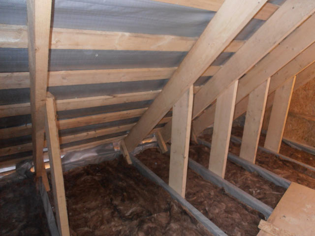 Ensuite, l'isolation thermique est montée sur le dessus. Les tapis de laine minérale sont posés bout à bout de manière à ce qu'il n'y ait aucun espace entre eux et les poutres et les plafonds. De la même manière, le matériau est placé en rouleaux.