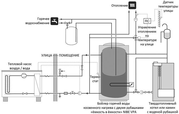 Le chauffe-eau se compose d'un réservoir métallique d'une capacité de 10 l à plusieurs milliers et d'un échangeur de chaleur intégré. Ce dernier est connecté au système de chauffage avec un thermostat pour régler la température de chauffage. Le réservoir est en acier inoxydable ou recouvert de l'intérieur de matériaux anticorrosifs. À l'extérieur, le conteneur est recouvert de plusieurs couches d'isolation thermique et d'un boîtier décoratif en plastique ou en métal mince. Selon l'option d'installation, le réchauffeur possède une ou deux pompes pour faire circuler le liquide de refroidissement et l'eau chauffée.