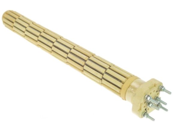 Les inconvénients de l'élément chauffant «humide» ont été éliminés dans la nouvelle conception. Pour cela, un élément chauffant ouvert a été placé dans un boîtier en céramique. Un réchauffeur «sec» est inséré dans un ballon métallique, qui est soudé à la coque de la chaudière. Cela a permis d'exclure le contact de l'eau avec la surface du chauffe-eau. Cependant, l'efficacité du système a diminué de 5 à 7% en raison d'une diminution du transfert de chaleur - le réchauffeur «sec» est devenu beaucoup plus chauffé.