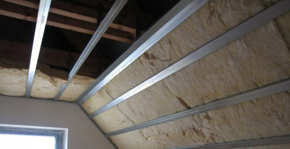- monter la caisse qui maintiendra l'isolation thermique sur les surfaces inclinées et au plafond. Utilisez des lattes de bois ou une planche mince, fixez avec des vis aux chevrons. Comme autre moyen de fixer l'isolant, vous pouvez utiliser un fil métallique ou un fil de nylon, qui est tiré en zigzag le long de la quincaillerie vissée dans les nervures du chevron;