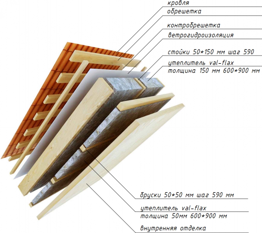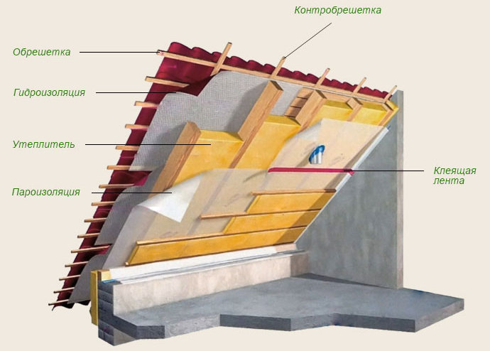 Pour l'isolation thermique, la laine minérale est utilisée uniquement sur les toits où un pare-vapeur est créé. Une telle protection élimine les vapeurs d'air situées dans l'épaisseur de l'isolant. Entre l'isolation et le toit, il reste une certaine quantité d'espace libre pour que le toit soit aéré. Pour cette raison, le matériau de couverture est posé sur une caisse montée sur une contre-caisse.