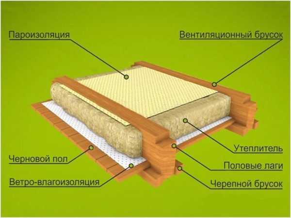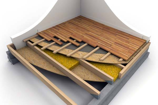 Pour isoler le sol du socle, il est conseillé de choisir des poutres avec des sections de 50 à 100 mm. Ils sont montés par le bas, les vides entre eux sont remplis d'une couche isolante. Ensuite, les planches sont empilées.