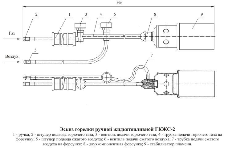Le brûleur à gaz a une conception assez simple. C'est un verre en métal et équipé d'une buse et d'une poignée qui est montée sur le corps. Pour la fabrication de la poignée, vous pouvez utiliser du plastique ou du bois résistant à la chaleur. Le gaz pénètre dans le boîtier en passant par le canal de gaz. Dans la plupart des cas, le propane est utilisé sous pression pour faire fonctionner le brûleur.