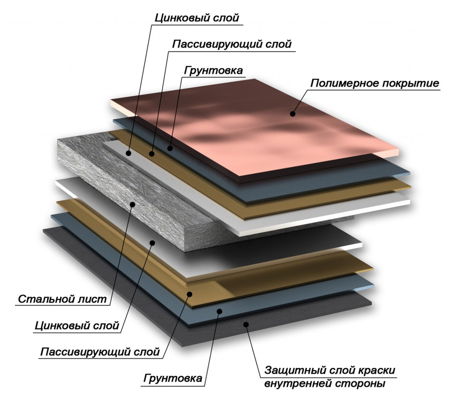 - De la face avant, l'un des 6 types de revêtement polymère est appliqué sur la feuille. Le coût et la durée de vie du toit dépendent du polymère.