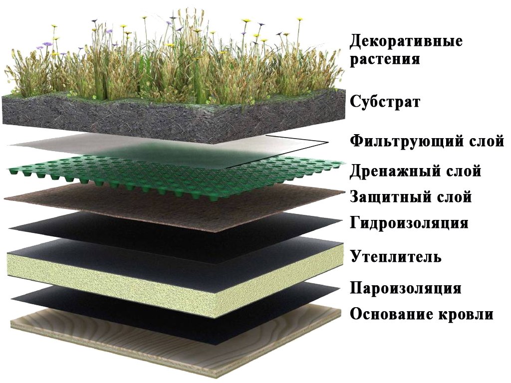 L'épaisseur de la couche de sol dépend du choix du type de plantes plantées sur le toit. Par exemple, les types d'herbe à gazon et de couverture végétale poussent confortablement avec une épaisseur de sol de 5 à 10 centimètres. Si vous envisagez de faire pousser un jardin à part entière sur le toit, il est nécessaire de prévoir une couche de sol de 1 mètre. Il existe un certain nombre d'exigences pour les sols.Léger en poids, de composition mécanique moyenne, poreux, à forte intensité d'humidité, avec de la tourbe neutre adaptée aux engrais ou mélangé à de l'argile fine expansée. Pourvu que la structure du sol soit suffisamment solide, utilisez un sol léger en y ajoutant de l'argile expansée (15-20%). Dans le cas de l'affaissement du toit, la couche supérieure du substrat est mélangée avec des graines d'herbe.