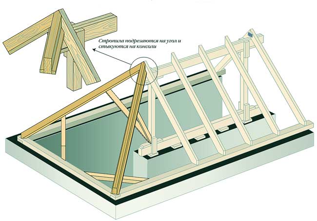 Dans le premier cas, les chevrons sont installés, en direction des coins intérieurs des murs. Dans la deuxième variante d'agencement - à l'extérieur.