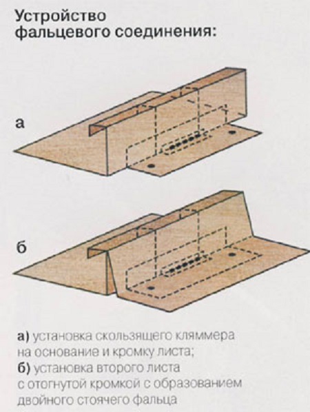 Les klyammery sont de deux types: rigides et mobiles. Il est conseillé de combiner ces types de fixations, car sinon la surface du toit pourrait gonfler en raison de déformations thermiques associées aux changements de température saisonniers. La dernière étape de l'installation du toit est le traitement des pignons, des crêtes, des patins et des jonctions.