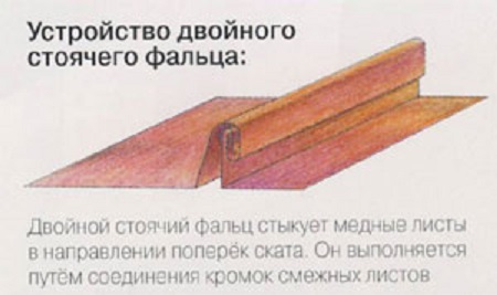L'installation d'une toiture en cuivre est réalisée à l'aide d'éléments tels que des peintures.Ce sont des flans spéciaux représentant un long fragment de cuivre ayant des plis sur les côtés. Il y a deux plis dans ce cas - petit et grand. La hauteur du premier est de 25 mm et la seconde de 35 mm. Les peintures peuvent être fixées en utilisant la technique du double pli debout. Dans ce cas, le grand pli est plié sur le petit pour obtenir une forme en L, puis le composé résultant est à nouveau plié. À ces fins, ils utilisent un outil spécial - un cadre.