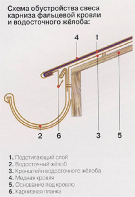 L'installation d'une toiture en cuivre commence toujours par des surplombs d'avant-toit, après la disposition dont ils passent déjà à d'autres travaux. Une grille de ventilation est installée pour fermer l'espace de ventilation du comptoir et protéger l'espace sous le toit des oiseaux et des insectes. Ensuite, les évidements de la base sont réalisés sur la corniche. Seul un évidement de 5 mm suffit pour monter les supports sous le drain. Les gouttières sont connectées à l'aide d'éléments d'amarrage spéciaux, et leur pente est sélectionnée dans les 3 à 4 mm par 1 mètre. Cela est nécessaire pour assurer un débit d'eau normal, et une pente similaire est obtenue en pliant les montures à différents niveaux.