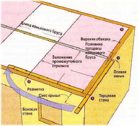 La garniture supérieure du toit est en bois dont l'épaisseur est égale à la moitié de celle de la poutre faîtière. Après cela, le rail de mesure est appliqué à la ligne précédemment marquée à une extrémité, et l'autre est situé le long de la paroi latérale, ce qui vous permettra d'obtenir le site d'installation des chevrons intermédiaires.