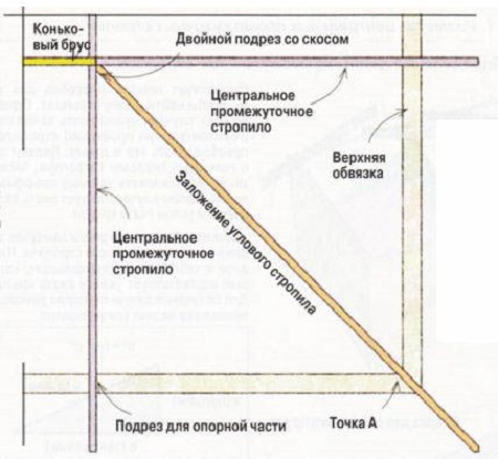 La position des éléments d'angle du toit et des chevrons intermédiaires est marquée une fois l'étape précédente terminée. La figure ci-dessous montre un chevron incliné (vue de dessus). Il faut se rappeler que les chevrons ont d'une part une coupe oblique, ce qui leur permet d'être solidement fixés à la crête. La poutre elle-même a une double contre-dépouille, conçue pour installer des éléments d'angle.