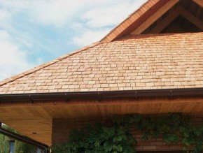 En raison de la grande longueur du surplomb de la toiture dans le style d'un chalet, sous la protection se trouvent la zone aveugle, les murs, le sous-sol. Cette conception fournit une certaine ombre de fenêtres, ce qui peut être utile pour les maisons construites dans des climats chauds. Parfois, ils ont recours à une méthode intéressante: aux endroits du toit situés au-dessus des fenêtres, ils font des lacunes en forme de treillis. Il est semé en été par le tissage des plantes et en hiver, lorsqu'il n'y a pas de floraison, une lumière supplémentaire se forme.