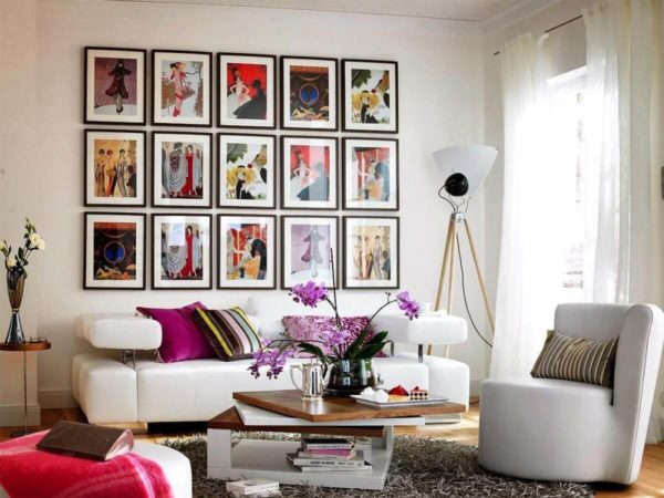 Il est préférable de suspendre des photos et des images en groupe, sans observer la symétrie, mais simplement de manière chaotique, en alternant les grandes et les petites œuvres. En général, cette innovation a l'air fraîche et vous fait considérer ces articles de décoration plus longtemps.