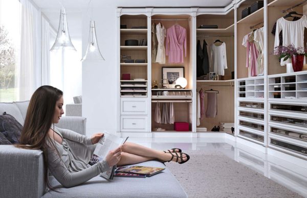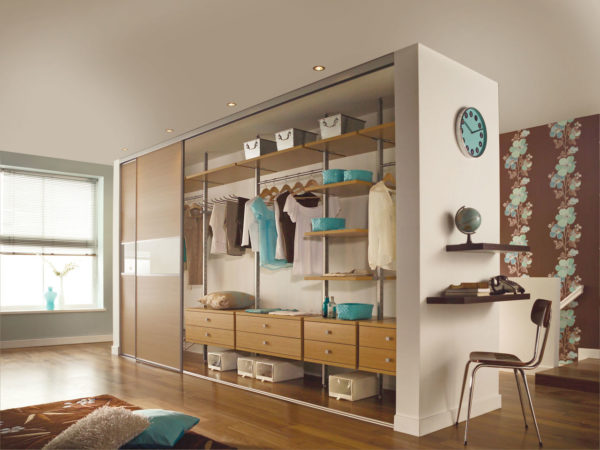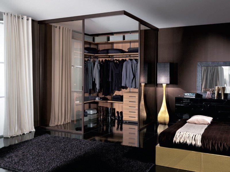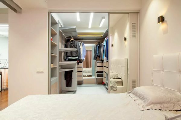 Récemment, une tendance à la mode est apparue d'utiliser l'espace derrière un canapé ou derrière un lit de dressing. Peut être réalisé en version fermée à l'aide d'une porte ou de rideaux ou en version ouverte. Avec la deuxième version du dressing, la chambre ne perdra pas, au moins visuellement, sa taille.