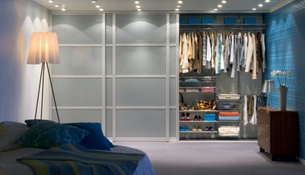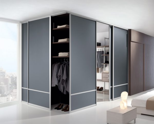 Il convient de noter que pour ce type de dressing, le couloir doit être suffisamment large, au moins 1,6 m, de sorte qu'il reste environ 80 cm d'espace pour le mouvement des membres de la famille.