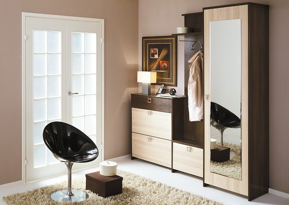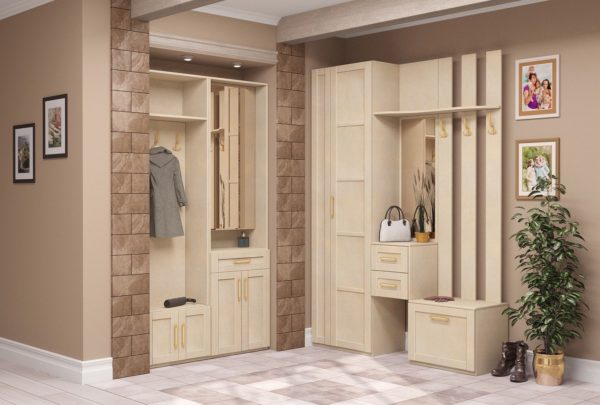 Ensemble de meubles pratique, qui peut inclure plusieurs choses utiles à la fois. Différentes compositions en sont composées, ce qui vous permet de créer des intérieurs originaux des couloirs. Un tel module comprend: