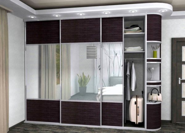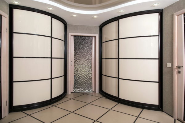 Armoires élégantes, assemblées sur commande. La partie avant d'un tel meuble a une forme incurvée, ce qui confère à l'intérieur originalité et sophistication. Il sera possible de placer une telle armoire uniquement dans une pièce spacieuse.