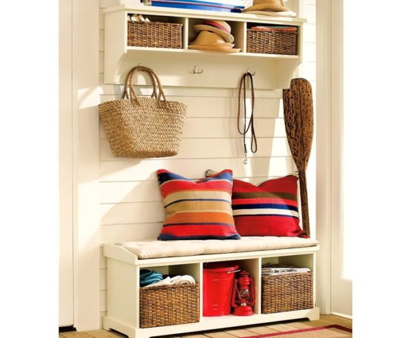 La conception moderne de l'espace de vie se concentre sur la fonctionnalité et l'ergonomie, il est donc recommandé d'utiliser activement la zone utile du plan vertical dans le couloir. Le haut de l'armoire et les étagères ouvertes peuvent être utilisés pour stocker de petits objets en y installant des paniers en osier.