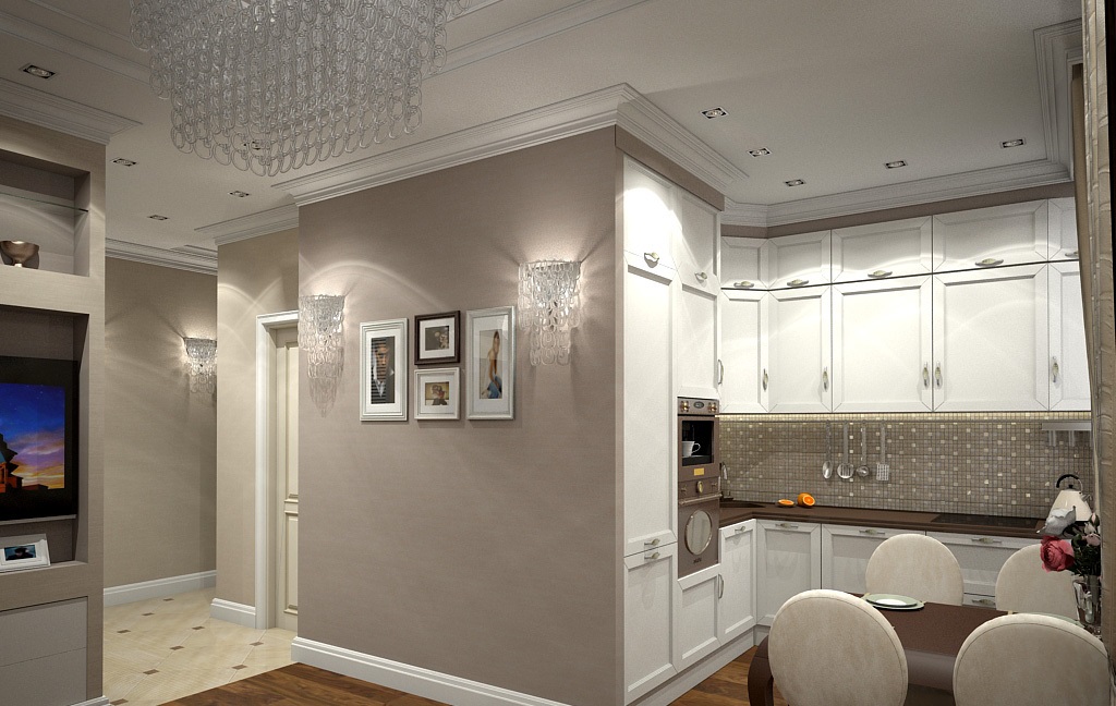 - Si l'appartement est un studio, il n'est pas nécessaire de séparer la cuisine et le salon avec un mur. Il suffit de faire une distinction minimale. Une telle solution offrira de l'espace et de l'espace.