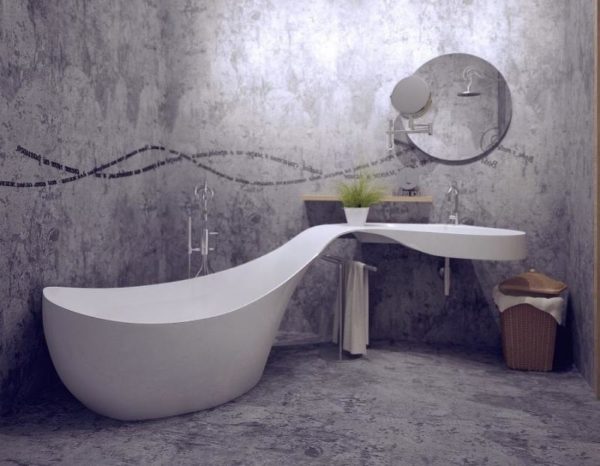 Les murs et les planchers en béton ont tendance à créer un arrière-plan pour la plomberie blanc comme neige. Il est recommandé de combiner avec des jeux de couleurs monochromes, des meubles aux lignes arrondies.