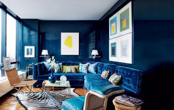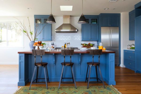 Le gris neutre et le vert ou le jaune joyeux appartiennent depuis longtemps au passé. Les nuances bleu foncé et cobalt soutiendront le style rugueux du mur de briques et des comptoirs en bois, populaires ces dernières années.