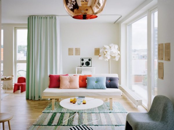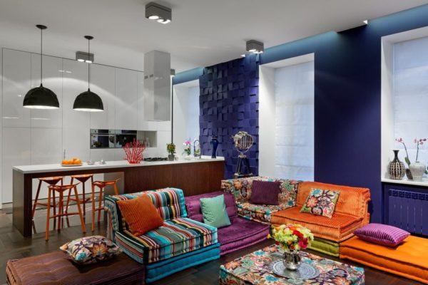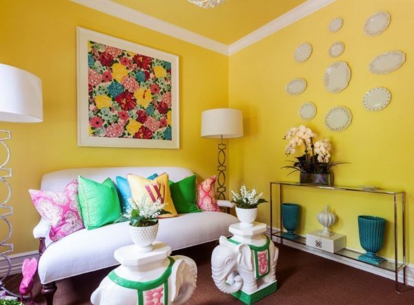 Ensuite, les objets qui se trouvent dans la pièce peuvent être de la même couleur. Pour ce faire, il suffit de colorer les choses en couleur, pour qu'il y ait une combinaison avec des murs brillants;