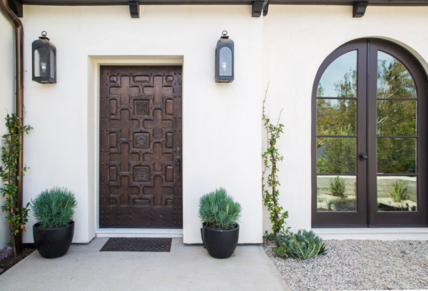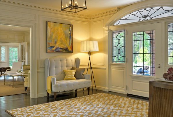 Près de la porte d'entrée, vous pouvez mettre plusieurs pots avec des plantes d'intérieur. De plus, lorsque vous choisissez la couleur de la porte de l'extérieur, vous pouvez vous concentrer sur des couleurs plus vives;