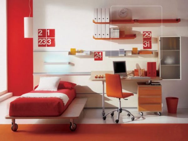 La couleur rouge symbolise l'activité, de sorte que les enfants qui ont une pièce remplie d'éléments de cette couleur deviennent très mobiles et énergiques. L'utilisation de rouge à l'intérieur de la pièce convient aux enfants à faible activité, ce qui ne peut pas être dit des enfants hyperactifs - la couleur rouge est contre-indiquée pour eux.