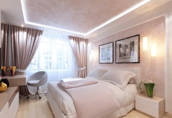 L'option idéale est une combinaison de beige avec une nuance de chocolat, la chambre avec l'ajout de gris semble sophistiquée. Si au lieu du gris, utilisez de l'argent, la pièce deviendra plus luxueuse.