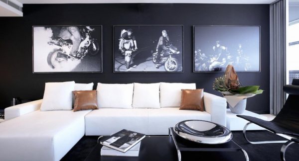 N'oubliez pas la conception des murs du salon. Dans ce cas, les photographies en noir et blanc sont les mieux adaptées à cela. Placez-les dans de simples cadres fins et réfléchissez à la façon de les accrocher au mur. Par exemple, organisez-les sur des lignes paires ou créez une composition plus dynamique en utilisant des cadres de différents formats.