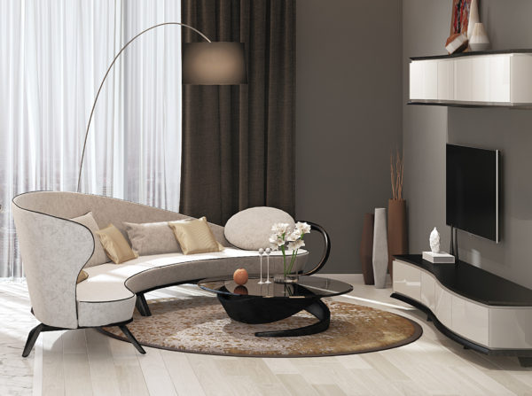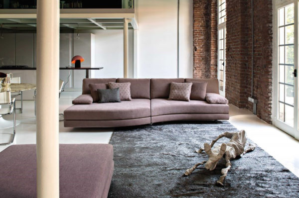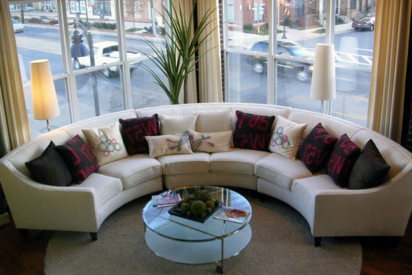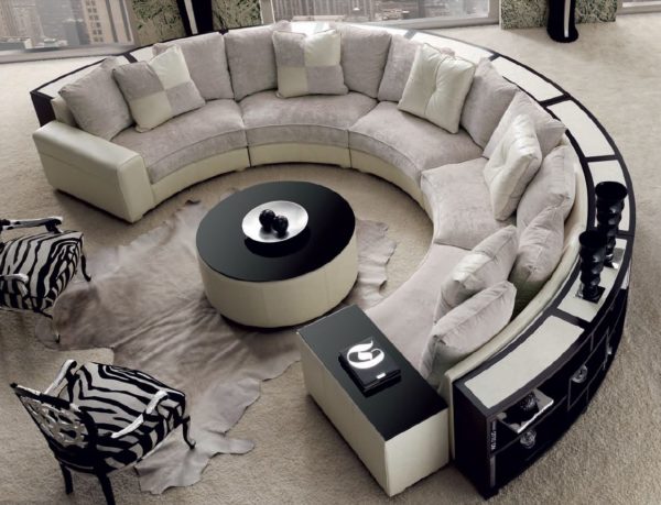 Pour entrer un canapé rond à l'intérieur, il faut que la pièce soit grande, sinon on peut obtenir un effet négatif lorsque le canapé occupe tout l'espace sans laisser «l'air» nécessaire autour de lui.