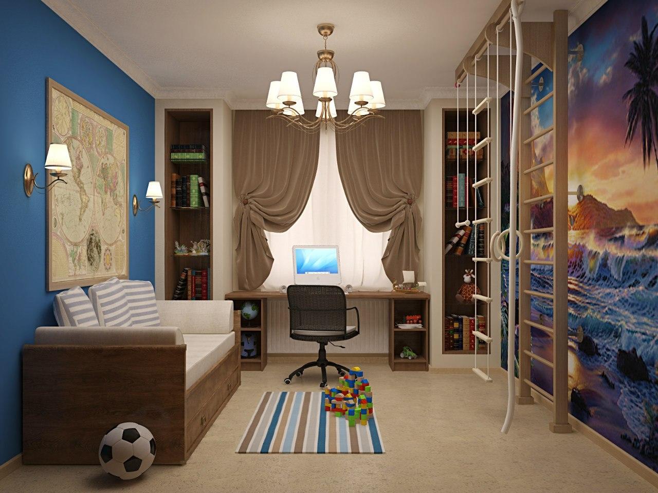 L'intérieur de la pièce pour un écolier se complique. Les autocollants et les images ne sont plus pertinents. Sur l'un des murs, vous pouvez accrocher une carte du monde, qui sera non seulement utile à l'étudiant, mais deviendra également un point coloré, divisant la pièce en zones. Il est important de faire attention au remplissage de la pièce:
