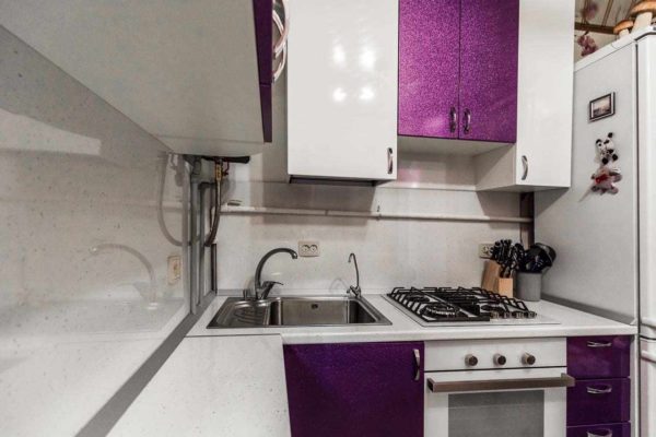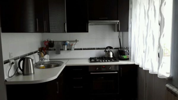 - Pour utiliser l'espace d'angle, vous pouvez y mettre un ensemble de cuisine. Il est souhaitable qu'il comprend des tiroirs où vous pouvez laisser divers accessoires et ustensiles. Les portes coulissantes sont également très pratiques et il est très pratique de les utiliser.