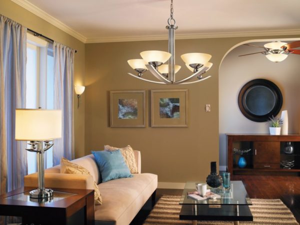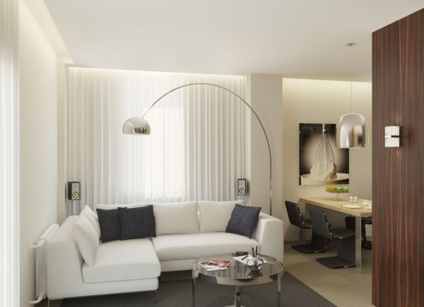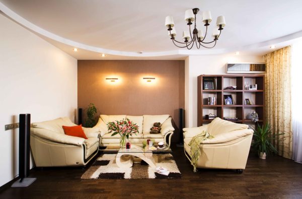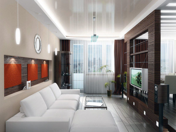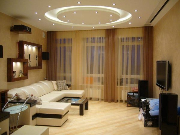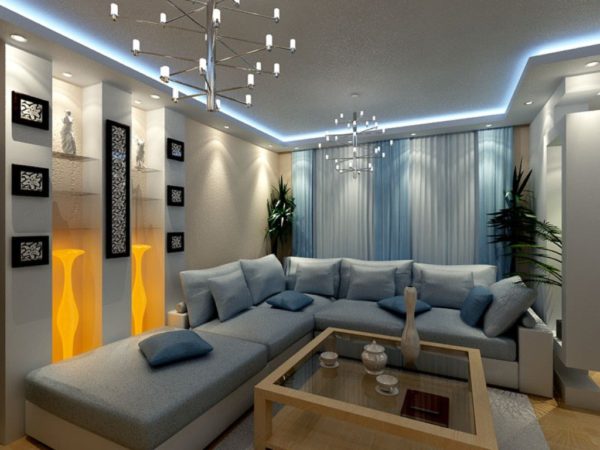 Il est peu probable qu'il soit possible d'augmenter l'éclairage naturel de l'appartement en créant une élégante fenêtre panoramique, vous devrez donc «inonder» le salon avec un éclairage artificiel.