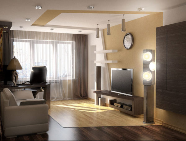 Au stade de la réparation, vous pouvez également proposer une solution visuelle au problème d'un petit salon, en utilisant, par exemple, les possibilités de conception de plafond, ses idées fraîches modernes de 2019 (photo):