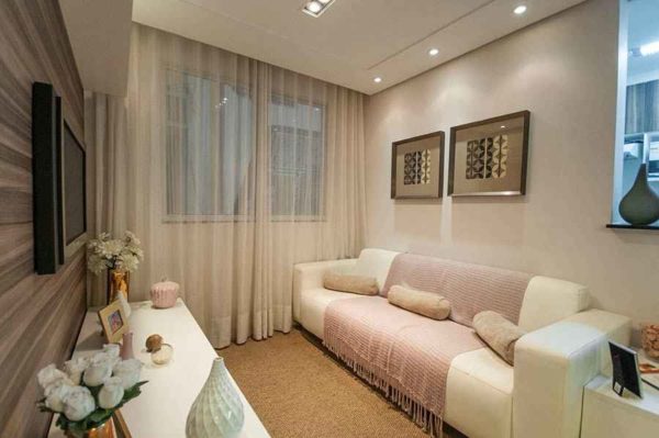 Comme cela a déjà été souligné, il ne devrait pas y avoir de «taches» contrastées dans un petit salon, seulement une abondance de lumière, l'utilisation de couleurs claires dans la conception de tout l'intérieur.
