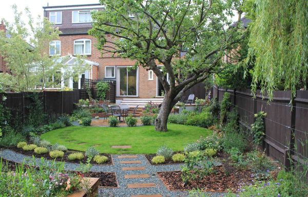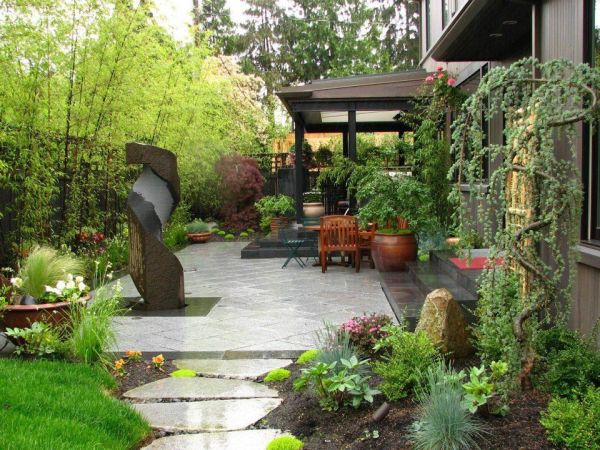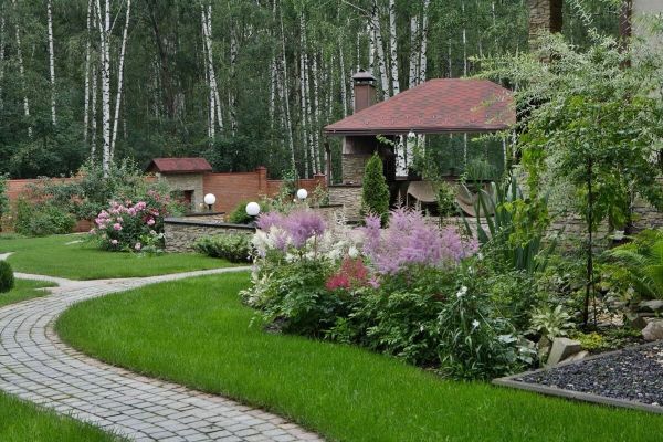 Une autre idée intéressante qui peut prendre vie. Sur le site, il vaut la peine de planter des fougères, des mauvaises herbes ornementales. Ils seront parfaitement combinés avec une pierre naturelle. Des pergolas en bois, des bancs en métal forgé aideront à compléter la conception.