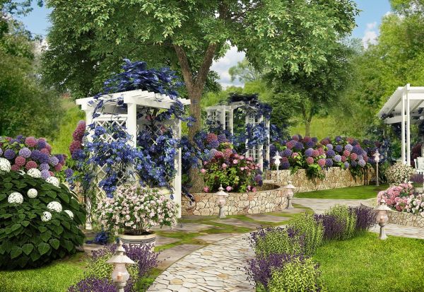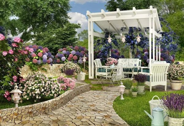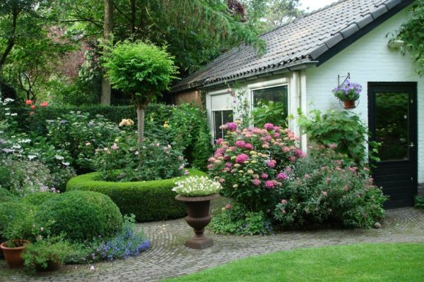 Si vous voulez être dans un jardin français ou anglais, vous devez organiser le site dans un style européen. Colonnes de fleurs, plantes hautes, chaises pliantes - tout cela se trouve dans le jardin européen.