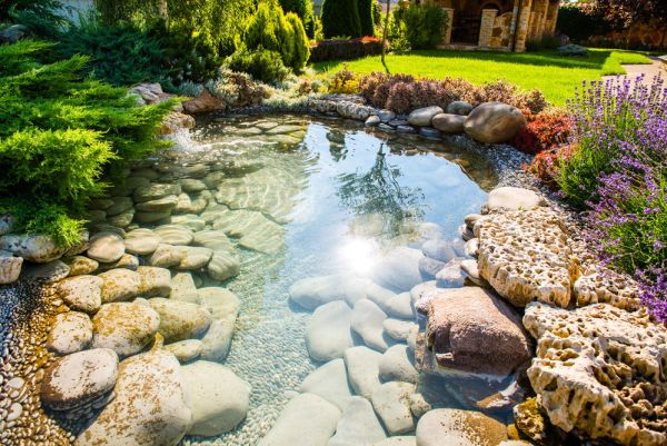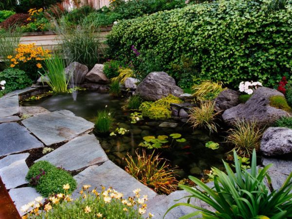 Les étangs sont encore plus attrayants dans le pays. L'eau va bien avec les herbes et les plantes ornementales. Un étang le long du bord peut être décoré de pierres, de petits cailloux. De grandes plantes plantées sur le rivage complètent parfaitement la composition.