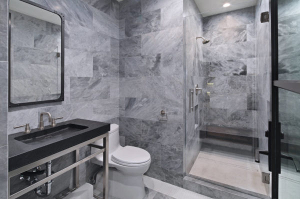 L'utilisation de marbre à veines grises ou blanches sera toujours pertinente. Vous pouvez utiliser de la pierre artificielle ou des céramiques qui imitent cette surface. A la sortie, on obtient un design moderne, mais en même temps avec un léger biais classique de la photo 2019.