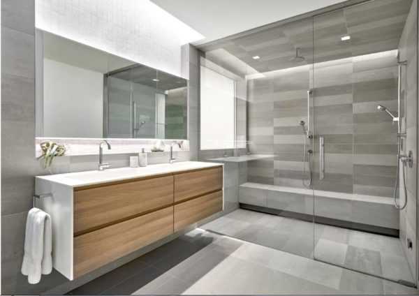 Il contient luxe, tranquillité, noblesse et paix. Si vous connectez la couleur grise avec des surfaces en bois ou leurs analogues, complétez l'image avec des accessoires et des luminaires blancs, un design très éclectique et moderne de la salle de bain avec cabine de douche 2019 sortira.