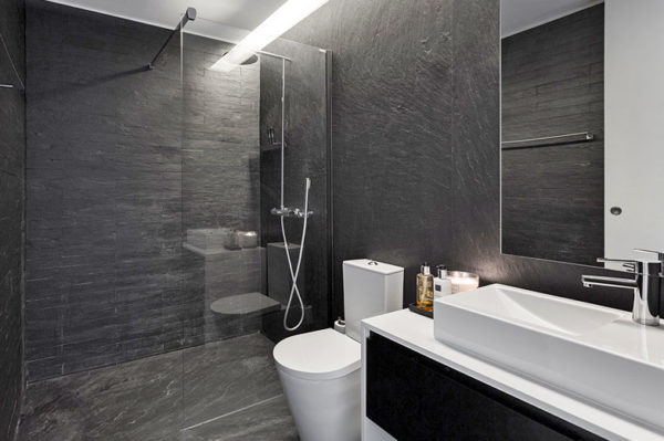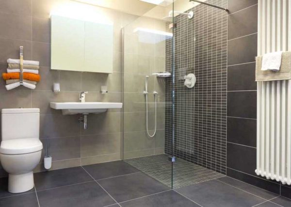 Le gris est la couleur préférée de nombreux experts et le design des salles de bains avec douche ne fait pas exception. Il met l'accent sur toutes les idées modernes et crée parfaitement un fond discret pour la plomberie blanche, il complétera le lustre du chrome, il se combinera parfaitement avec toutes les surfaces de la pièce en verre et miroirs.