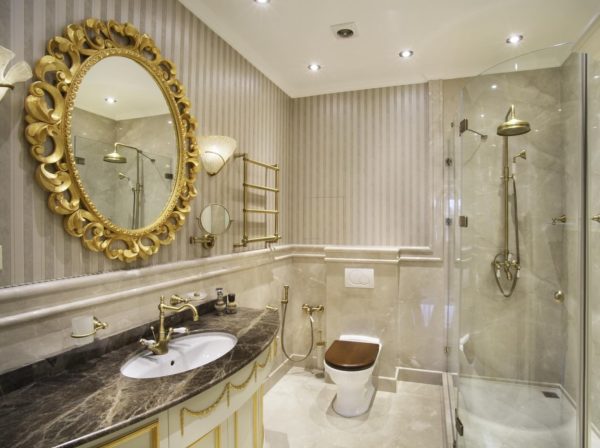 Dans le même temps, pilastres, douilles, moulures en stuc et ornements trouvent leur application. Les appareils de plomberie utilisent du cuivre ou de l'or stylisé en acrylique. Dans le style classique, vous ne verrez pas de formes directes et de lignes parallèles, seulement des ornements, des motifs, de la splendeur et des monogrammes.