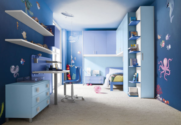La nuance bleue se marie bien avec un ton blanc neige, beige. Pourquoi ne pas concevoir une pièce dans un style marin. Tous les garçons de cette idée seront ravis.