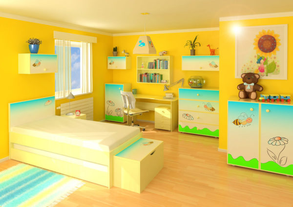 La seule nuance jaune est mieux utilisée comme accents. Sinon, la couleur peut nuire à la psyché de l'enfant, le rendant trop actif.