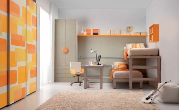 Les nuances ensoleillées donneront au bébé une bonne humeur. De plus, cette couleur encourage l'action. Pour l'intérieur ne s'est pas avéré trop coloré, les nuances doivent être correctement combinées les unes avec les autres. Pourquoi ne pas choisir des meubles en orange vif et pâle. Cette option est superbe. L'enfant pourra profiter d'un environnement confortable.