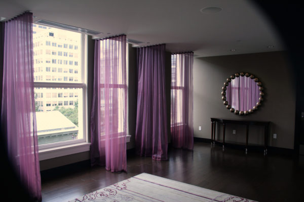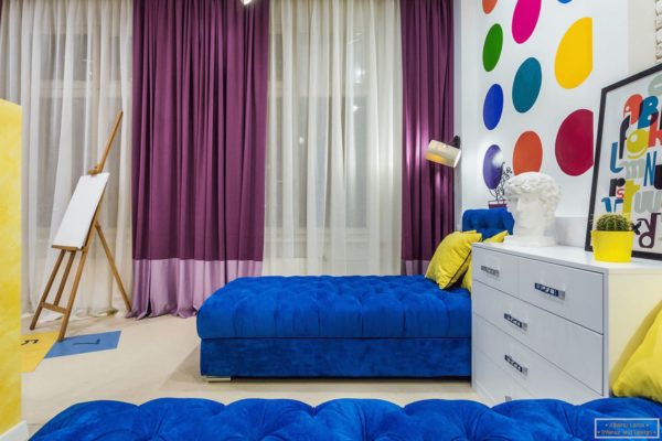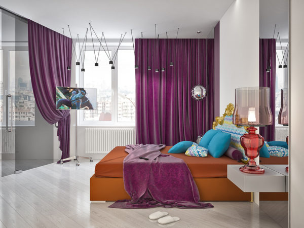 Les rideaux de couleur lilas confirmeront le style pop art. Le ton est capable de souligner le caractère démonstratif de la pièce, vous pouvez la diluer avec des éléments de décoration citron ou vert clair.